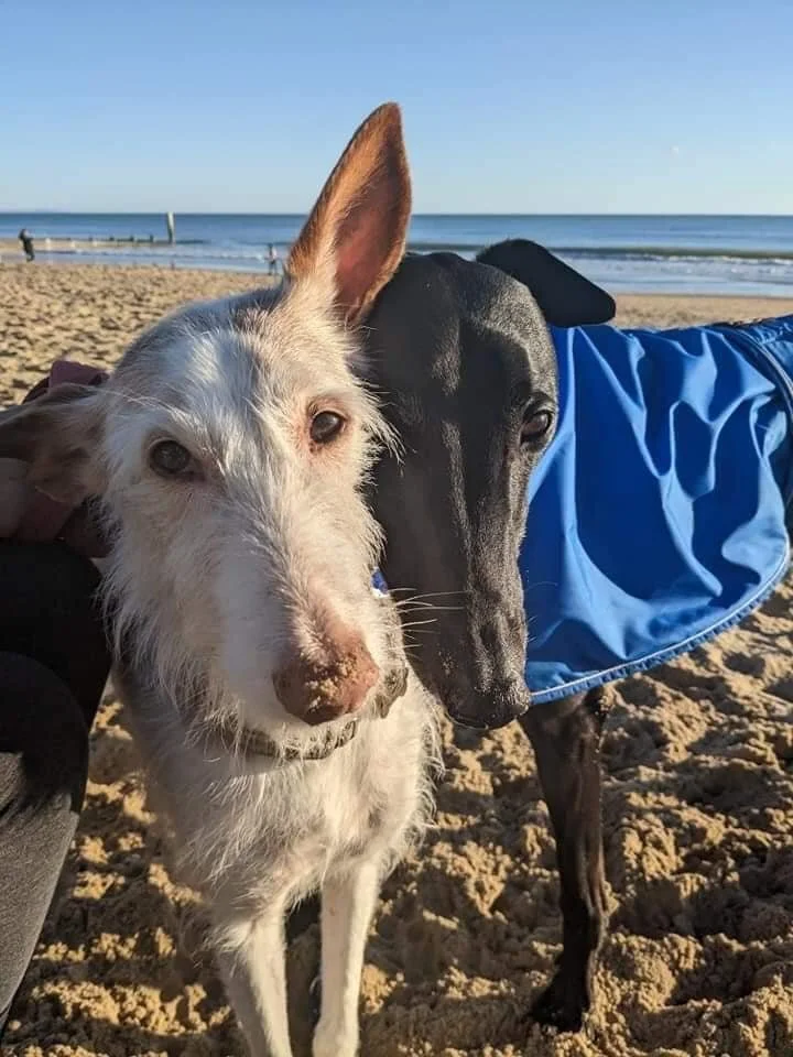 Remy (on the left), is a Podenco Canario/English Pointer cross. He was adopted by Josie in September 2020 after being with SFD (Sarah’s Foster Dog’s) for three years. He was initially found in a kill shelter in Gran Canaria at the age of 3. He raced Cani Cross with Sarah and was very good at it! He arrived very timid and scared of everything but has slowly come out of his shell. He is still very reserved and gentlemanly but such an easy dog and a joy to have! At DFD meets, you’ll find him hanging around the humans sniffing hands for treats!
